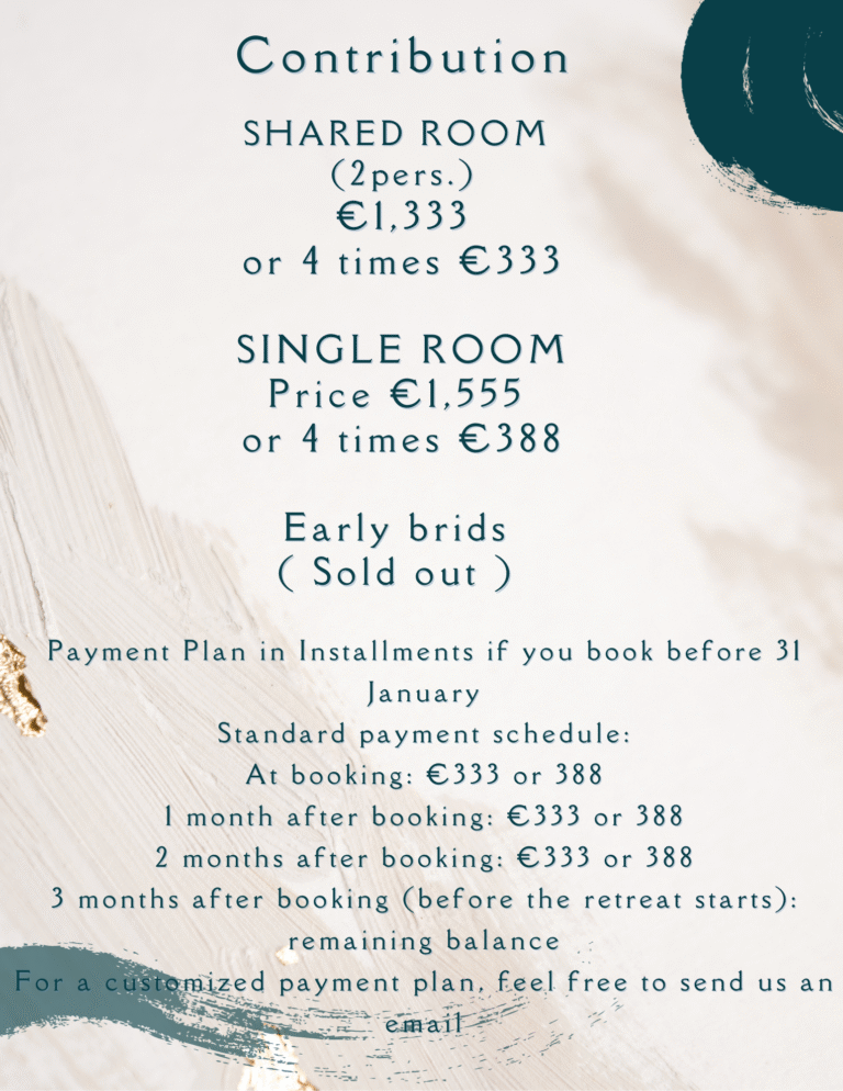 - Booking Confirmation: Your spot is confirmed after a non refund deposit payment of €333 our €388.